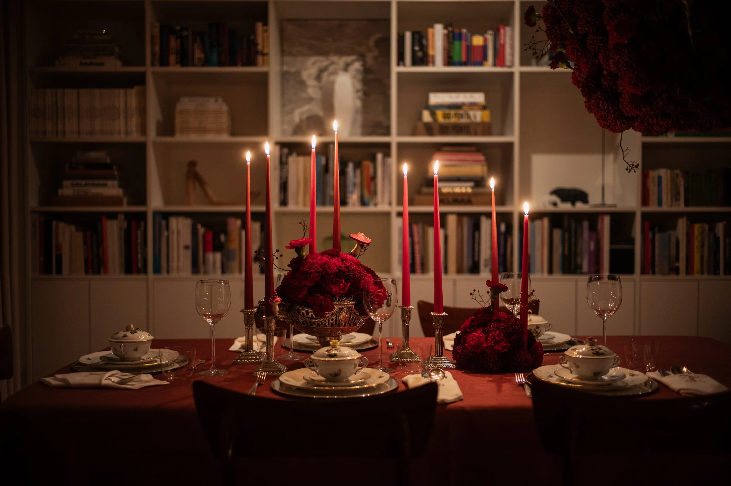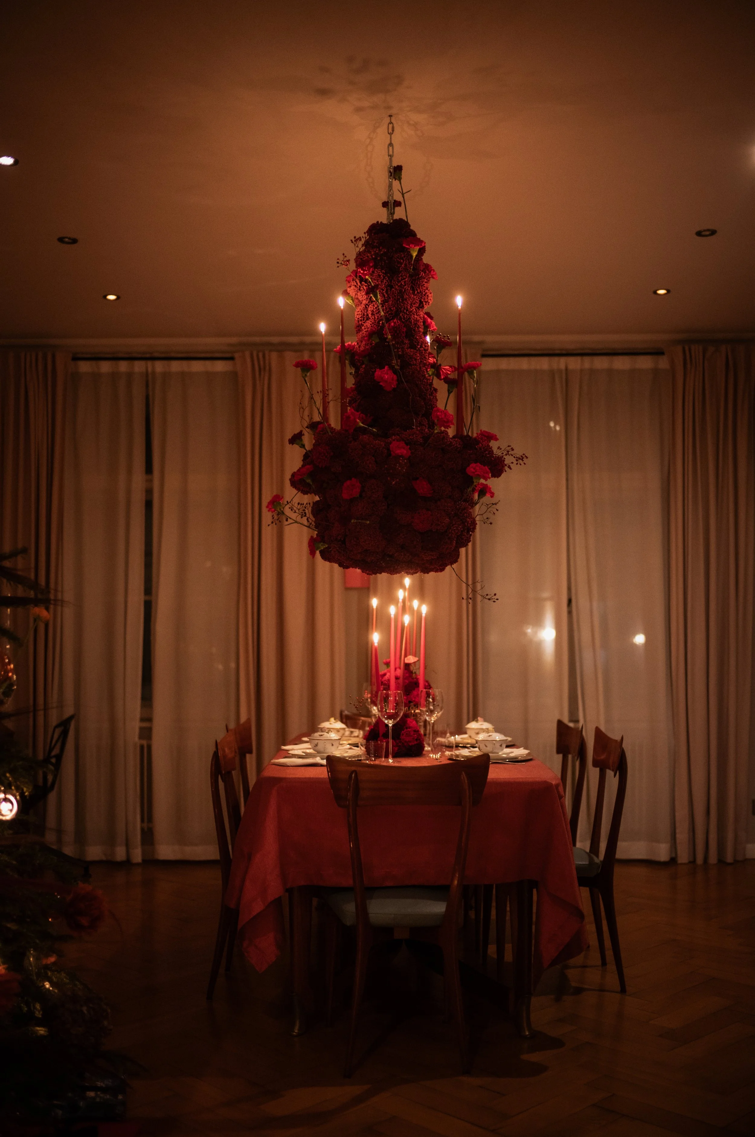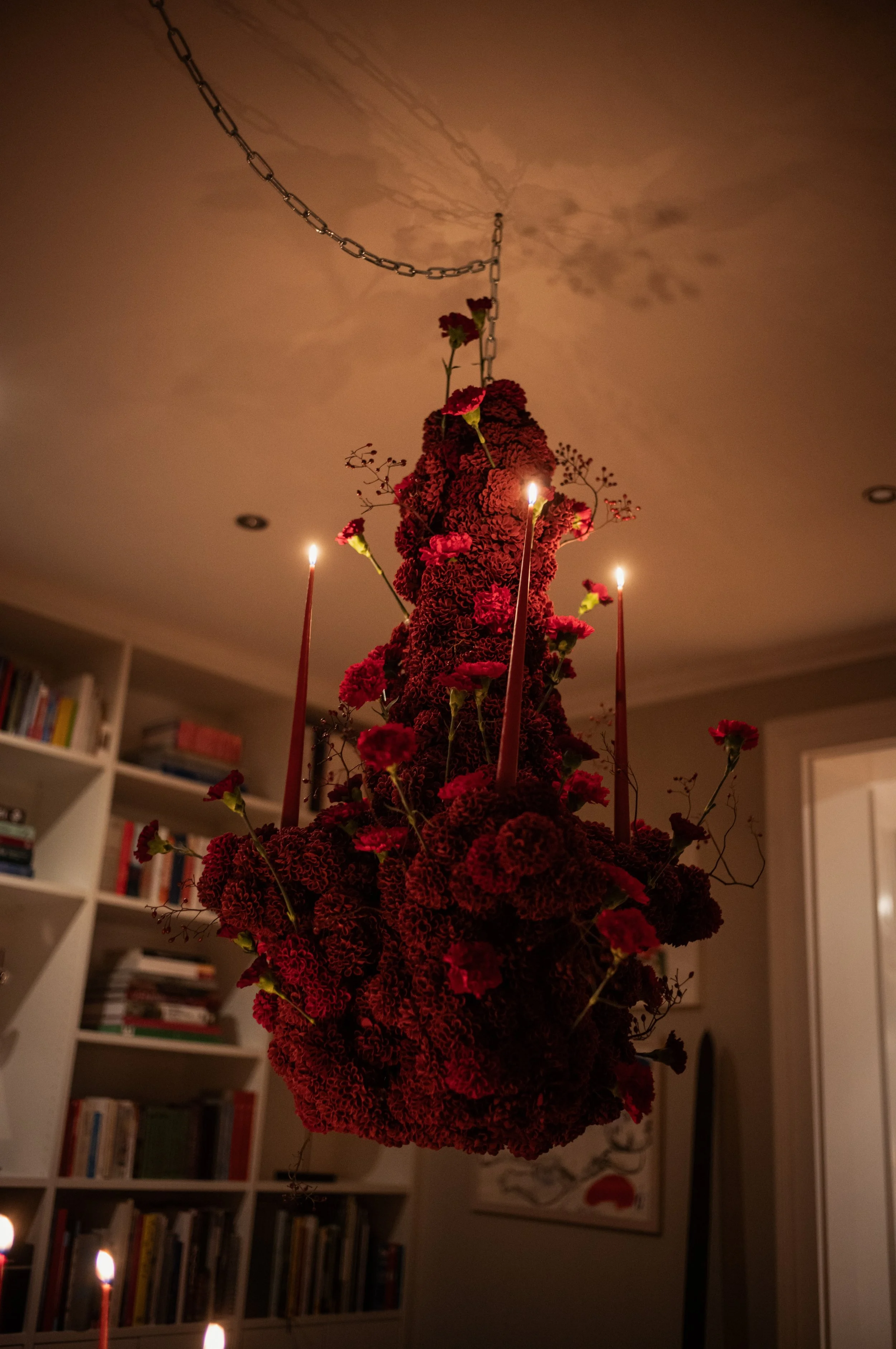 Blooming Chandelier Florale Installation für ein privates Dinner: Eine hängende Kronleuchter Komposition aus tiefroten Nelken, Kerzen und feinen Details, die eine festliche und atmosphärische Stimmung schafft.