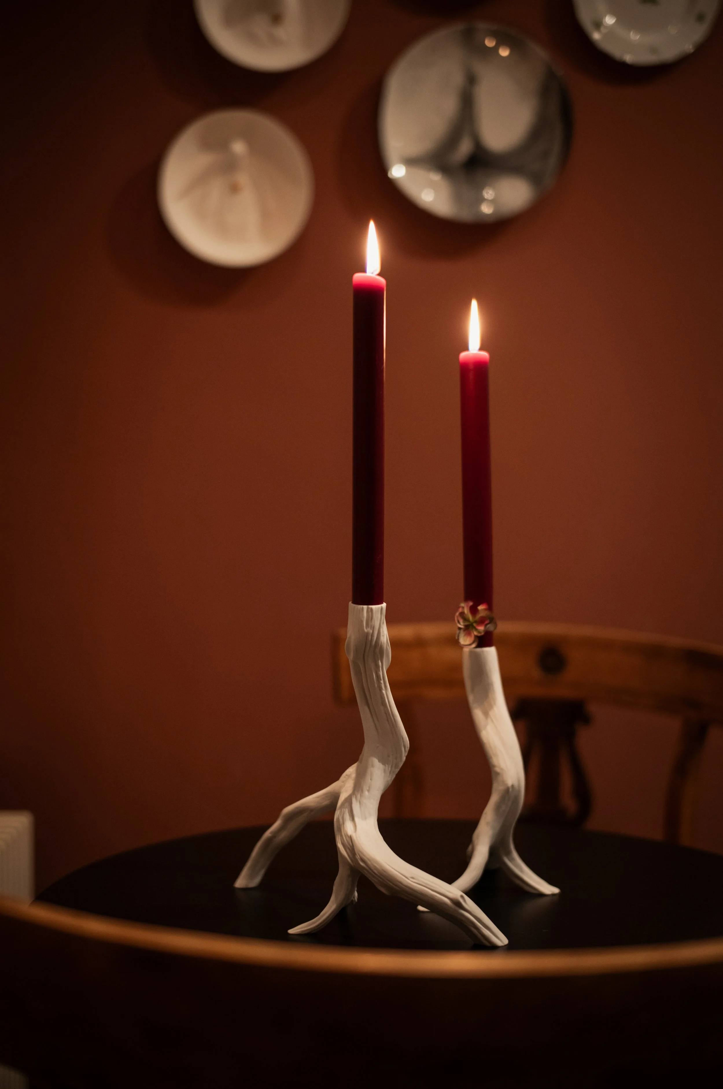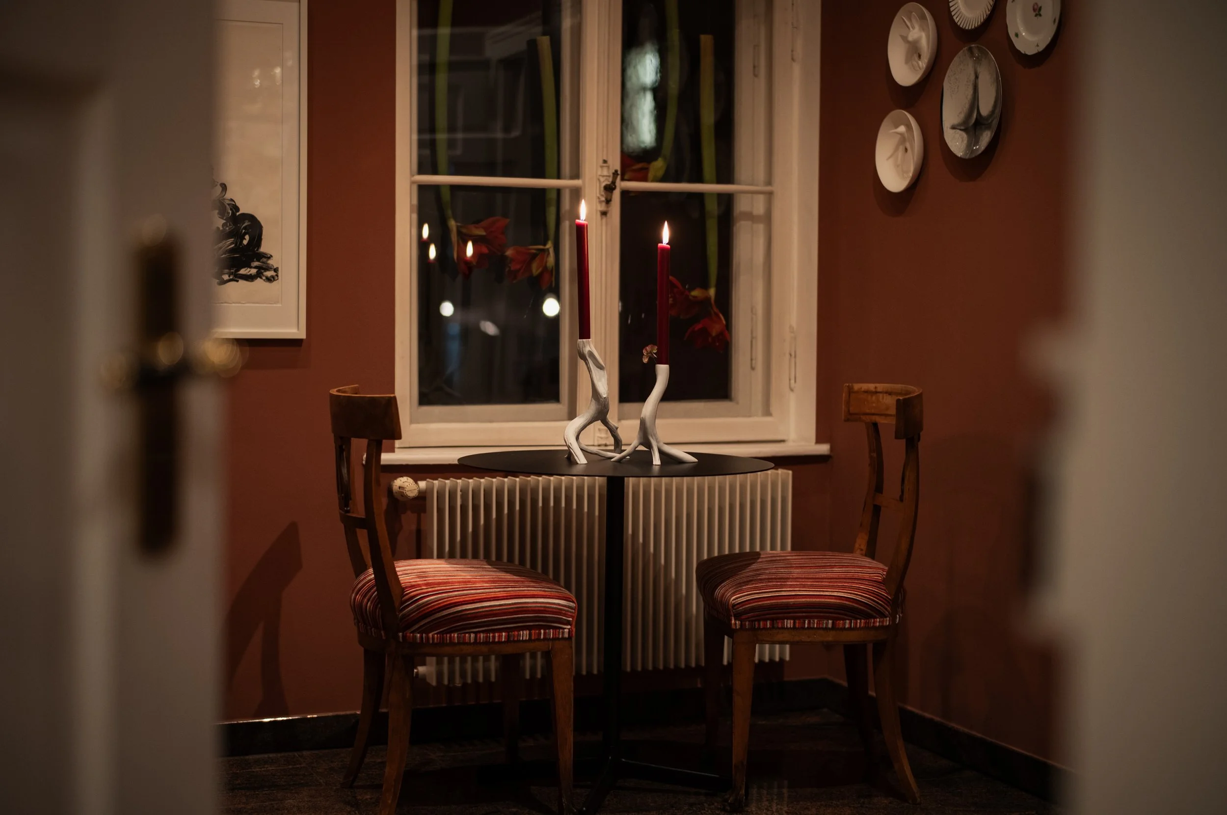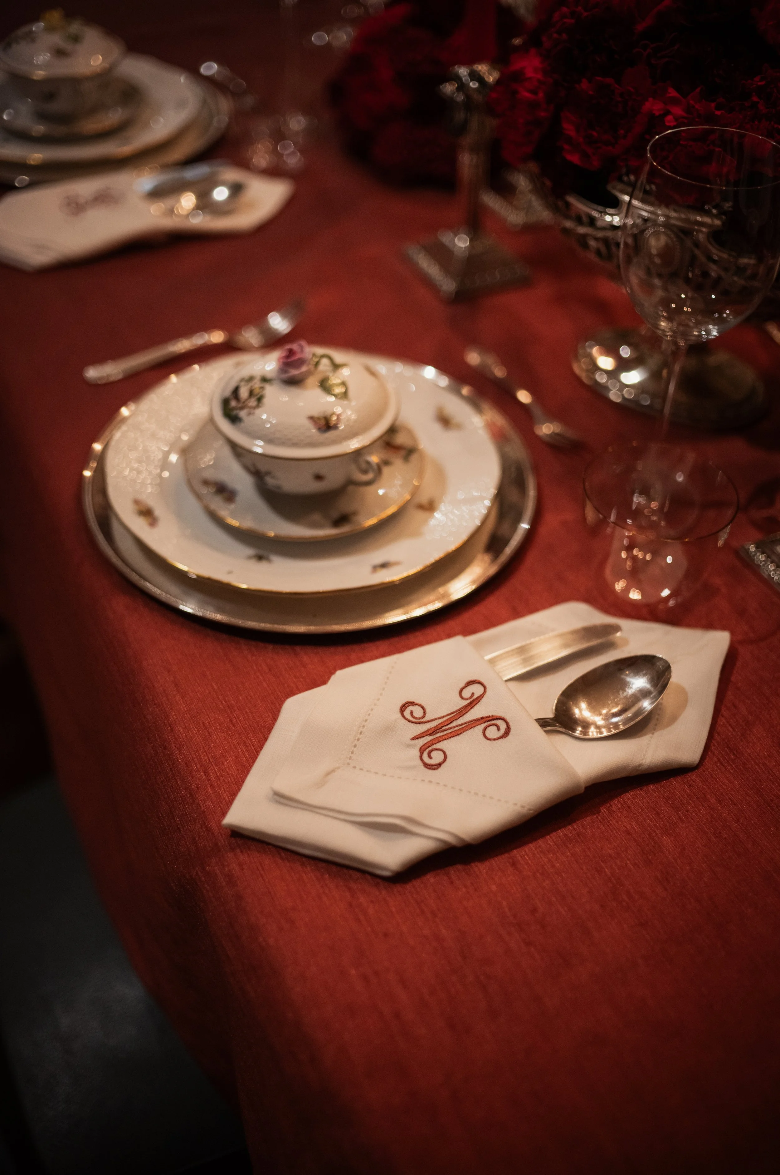 Blooming Chandelier Florale Installation für ein privates Dinner: Eine hängende Kronleuchter Komposition aus tiefroten Nelken, Kerzen und feinen Details, die eine festliche und atmosphärische Stimmung schafft.